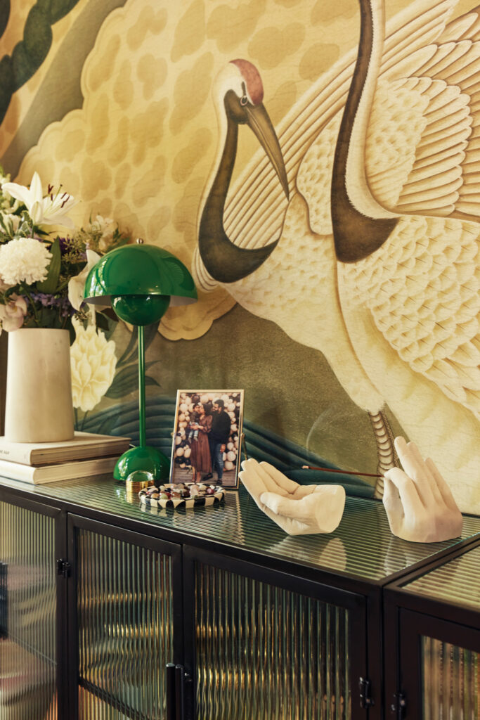 Japanese Cranes wallpaper by Schumacher, a nod to the family’s travels throughout Japan, runs through the dining room. Photo by Wade Hudson.