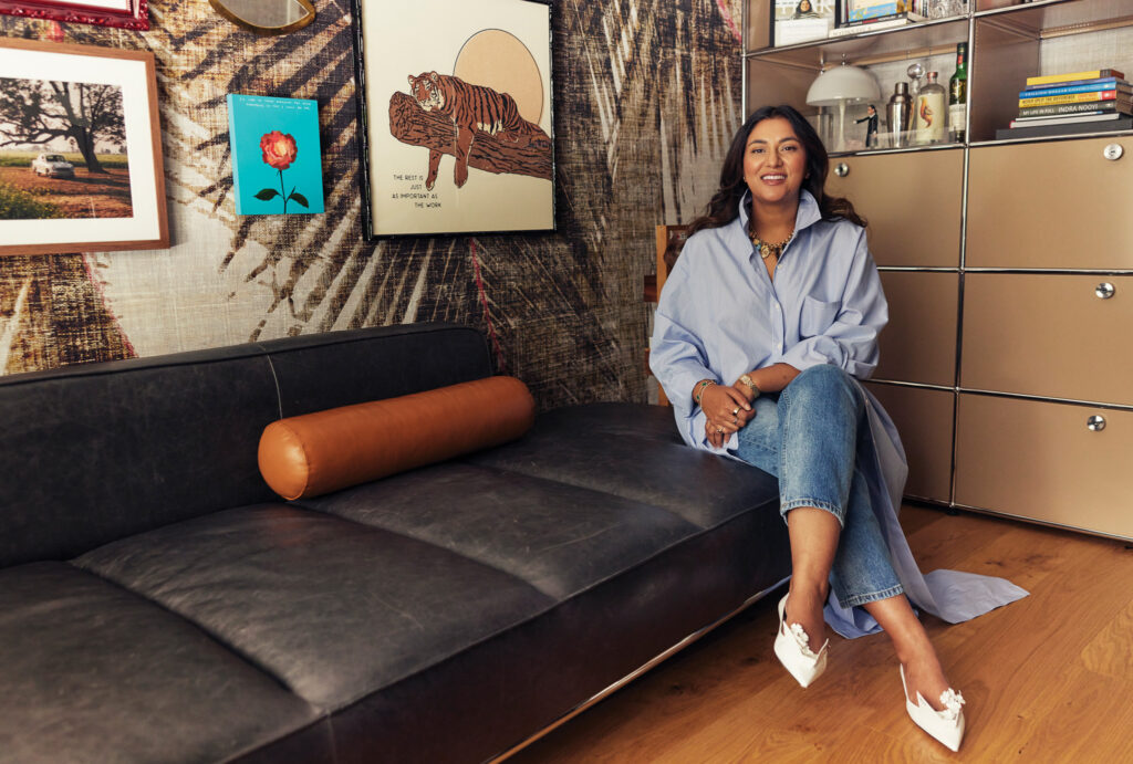 Patterned wallpaper by Élitis brings energy to Sharma’s office. “Even though our house is designed to be minimal, we’re such maximalists.” Photo by Wade Hudson.