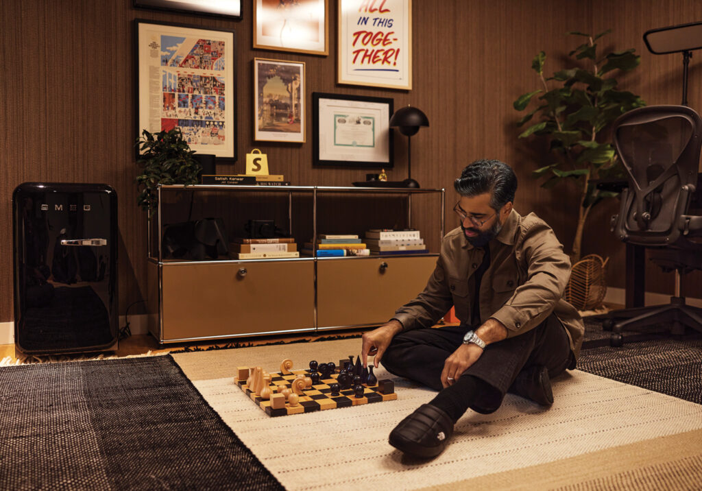 The couple, who have a five-year-old son, had traded their King West condo for a four-bedroom, three-bathroom home just months before the pandemic hit in 2020 and work went fully remote. But they were better prepared than most for co-working while cohabitating. Having worked on the job together while at Shopify, they had “already learned how to establish boundaries,” Sharma says, “which made work from home really easy.” They quickly added his and hers offices to their design plan—hers with tropical wallpaper and a print of a Bengal tiger above the reminder: “The rest is just as important as the work,” his with natural grasscloth wallpaper and mementoes of previous professional roles.