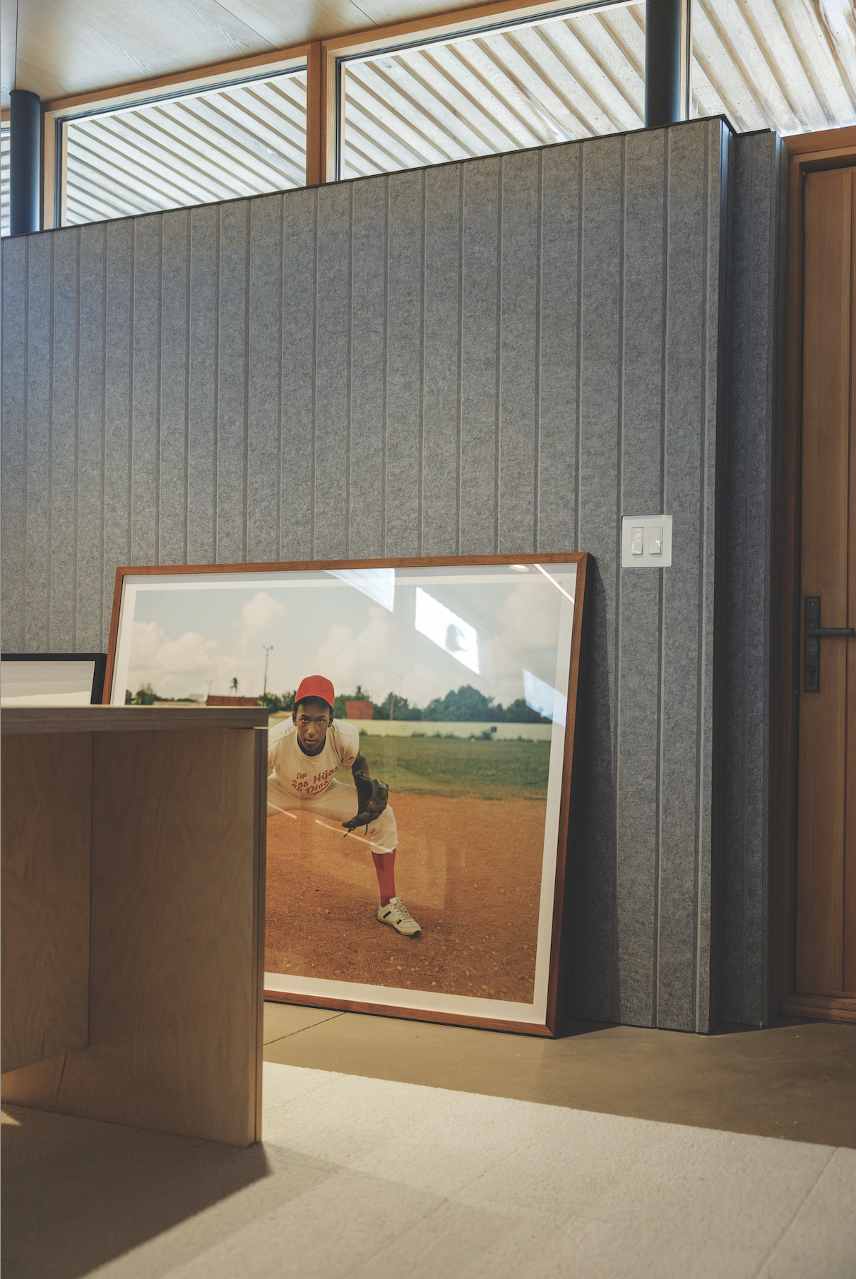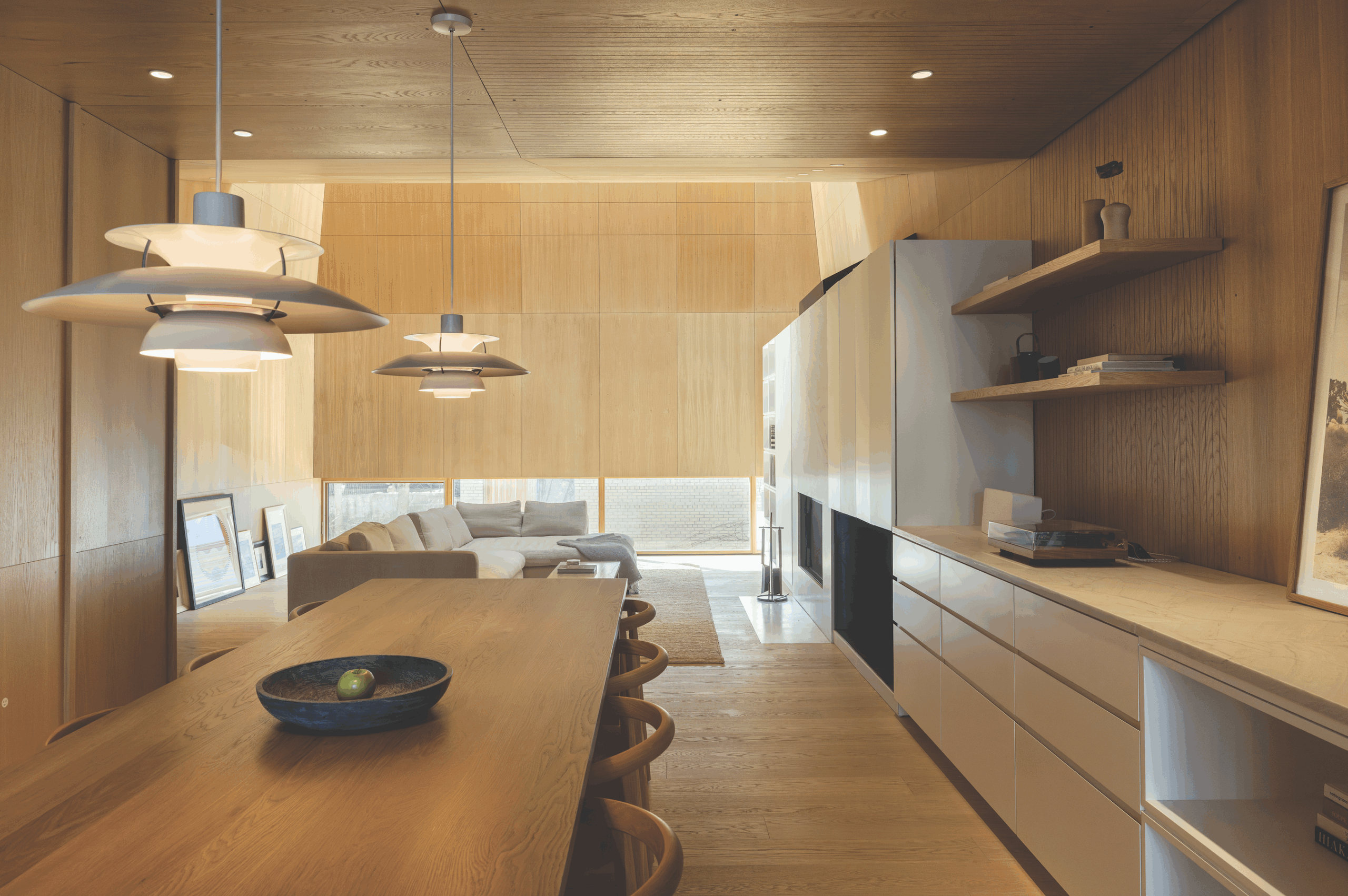 All that natural light does a great job of highlighting the artwork that Gandhi and his partner display throughout their home. Instead of creating the oh-so-popular gallery wall favoured in many contemporary homes, the couple have opted to instead lean frames against the white oak walls in their second floor living room. The decision was made for a very specific reason. “I never really had the nerve to put holes in the wood to hang them,” Gandhi says. “It’s a very informal gallery space where pieces are propped up. It brings the focus of your eyes down a little bit.” Some of his favourite artworks on display include a piece from Mi’kmaq artist Jordan Bennet, Sun is Very Strong-Punamujuikús, and a landscape photo by Northwest Territories photographer Angela Gzowski, which are enjoyed by friends, family, and the family’s cat—appropriately named Dali.