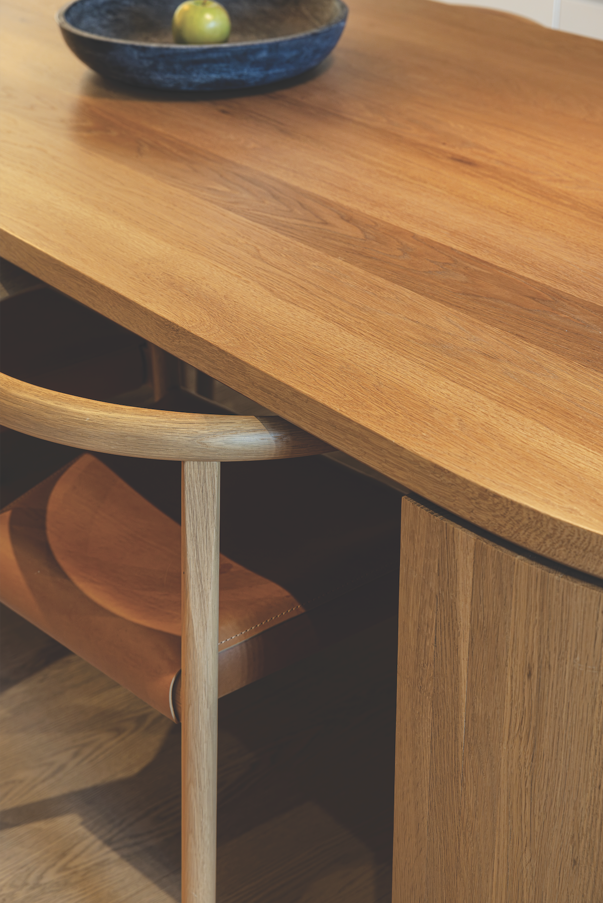 By the time the property was nearing completion in the summer of 2021, Gandhi’s studio team in Halifax had grown too large to accommodate them in the house. So, the architect pivoted to using the 1,200-square-foot ground floor space as a home office space for himself and his new partner, Jolène, a child psychologist. “Adrian works there as well when he’s doing his homework,” Gandhi adds. It’s also one of Gandhi’s favourite spots for a morning coffee, overlooking a courtyard between the house and a separate garage. “That’s where I go in the morning when the sun is shining,” he says, “it’s a really peaceful part of the house.” The versatile space also serves as a meeting hub for working on community design projects, like the Blue House, a facility for African-Nova Scotians who are facing barriers to housing. The project, which was completed in 2022, involved renovating a vacant house and transforming it into a home for 11 community members.