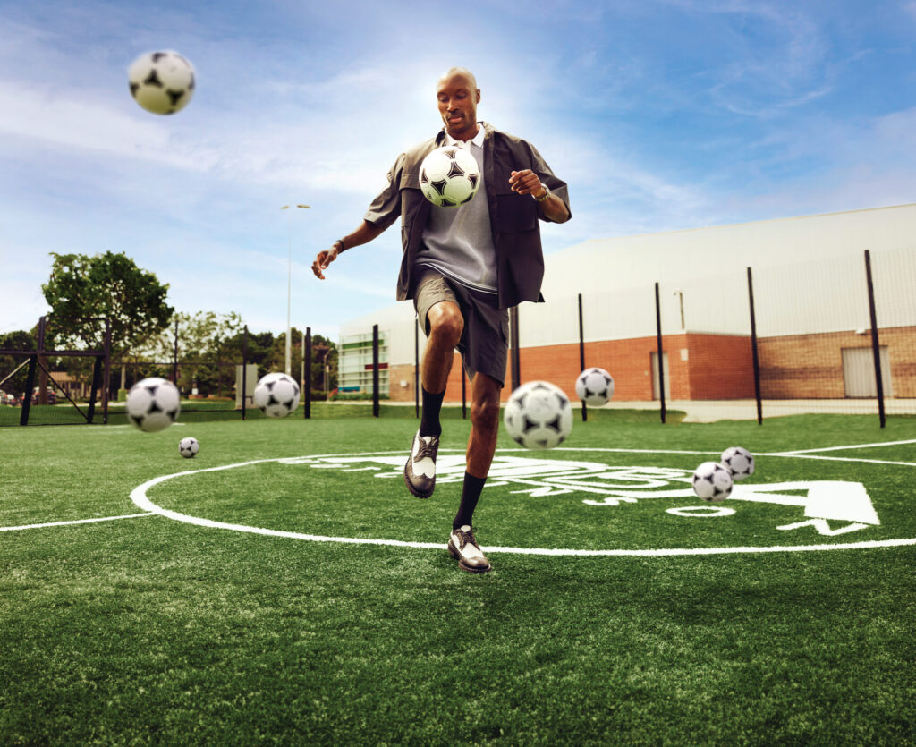 Atiba Hutchinson is runway ready. He’s wearing a COS knit golf shirt and short set that seem tailored to highlight his calf muscles, still lean and taut with tensile strength even 11 months into his retirement. Add the black socks and black-and-white wing tips, and Hutchinson, a Canadian soccer le